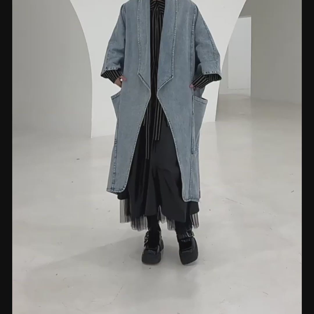Casaco longo em denim de caimento fluido, com modelagem oversized e construção pensada para sobreposição, criando uma silhueta marcante sem excessos.